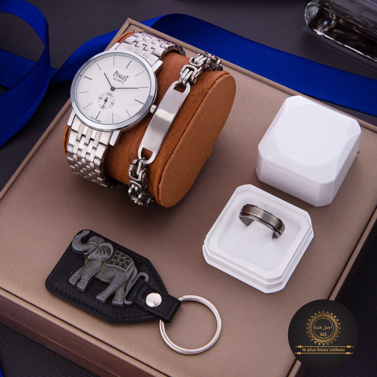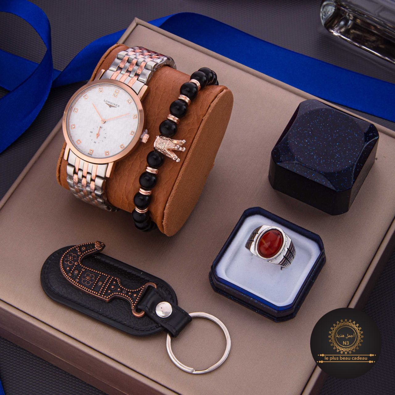 طقم متكامل يجمع بين الأناقة والذوق الرفيع، مثالي للإهداء في مختلف المناسبات. يتكون من ساعة يد عصرية، سوار رجالي، خاتم بتصميم مميز، وميدالية مفاتيح أنيقة. يتوفر الطقم بأربع ألوان مختلفة لتناسب جميع الأذواق والستايلات.