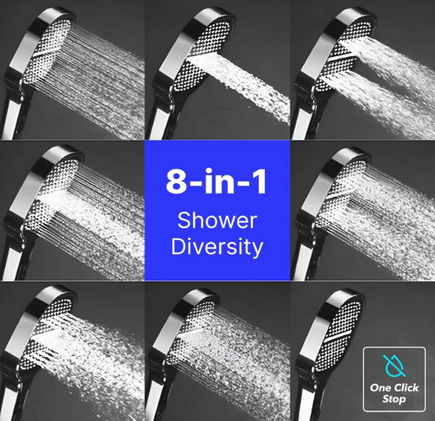 رأس الدش 8-في-1 يمنحك تجربة استحمام فاخرة بفضل 8 أوضاع رش مختلفة تناسب كل احتياجاتك: استرخاء، تنظيف عميق، تدليك، أو شطف سريع.